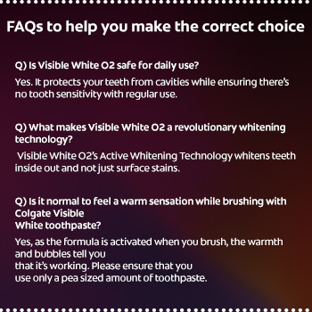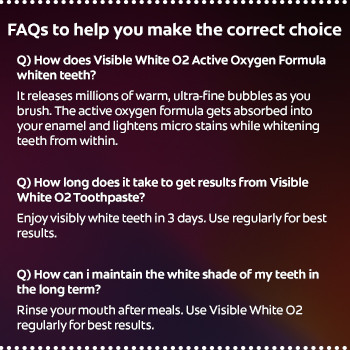 NOTICEABLY WHITER TEETH in 3 DAYS: Colgate Visible White O2’s Active Oxygen technology starts whitening your teeth in 3 days and offers you noticeably whiter teeth than ever before when used as directed on the pack.