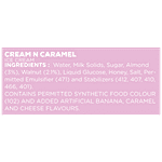 Water, Milk Solids, Sugar, Almond (3%), Walnut (2.1%), Liquid Glucose, Honey, Salt, Permitted Emulsifier (471) And Stabilizers (412, 407, 410, 466, 401). Contains Permitted Synthetic Food Colour (102) And Added Artificial Banana, Caramel And Cheese Flavours.