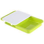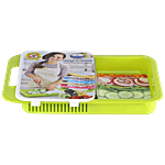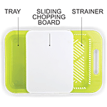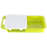 Joyo Plastics Chop N Store is made from high-quality food-grade plastic. The board is textured so that there are no accidents. It has an adjustable sliding chopping board that can be moved as per usage. It is lightweight which makes it easy to carry and handle. It has a strainer on one side so that you can use it to wash the veggies or fruits. It is easy to clean, store and maintain.