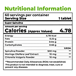 Spirulina Powder, Moringa Oleifera Leaf Extract, Chlorella Vulgaris Powder, Microcrystalline Cellulose (460(I)), Starch (1404), Hydroxypropyl Methylcellulose (464), PVPK 30 (1202), Croscarmellose (466), Talc (553 (Iii)), Magnesium Stearate (470(Iii)), Preservative (211).