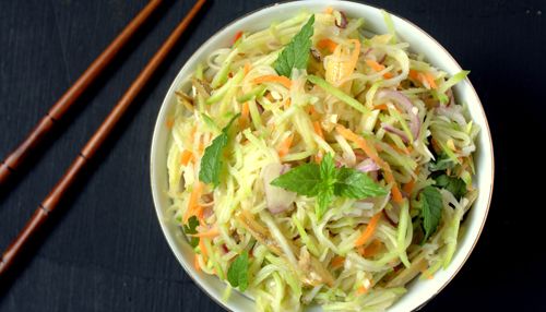 We recommed an exotic Thai version of this recipe, with julienned raw mangoes, soy sauce, ginger, honey, and crushed peanuts.