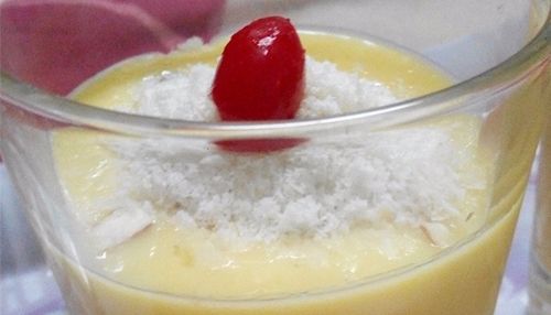 Red flower in a Yellow Dessert is like a sweet mango custard with a touch of cherries and coconut. A tendering taste that gives you a chilled and smooth feeling in summer. Mango is a delicious king of fruits.