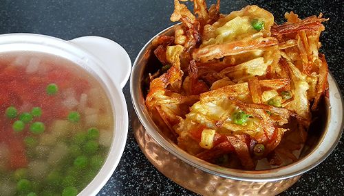 Clear vegetarian soup with vegetarian fritter