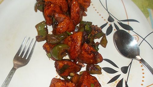 Turn off the flame, transfer the hot idli Manchurian on a serving plate and sprinkle some chat masala and black pepper over it.