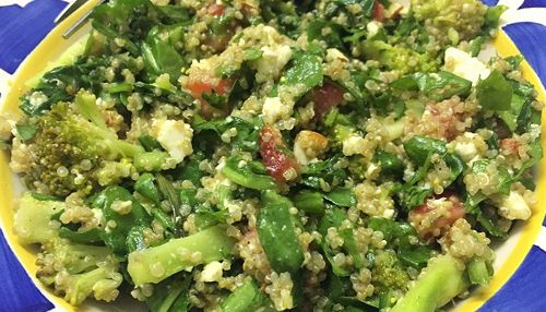 Rich in iron, protein and Vitamin C, this power packed meal is a wonderful blend of cooked quinoa, spinach, almonds, goat cheese, broccoli and strawberry. It is ideal to get your daily dose of nutrients.