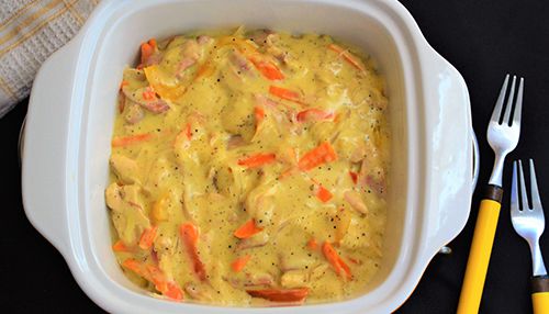 Chicken seasoned with salt and pepper, crunchy veggies immersed in creamy Kraft cheese and white sauce make for a delectable combination. It is best served along with garlic toast or mashed potatoes. To get that gooey and cheesy texture, make sure you serve it while it is still hot.