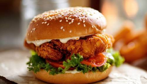 A crispy fried chicken piece layered with cool mint mayonnaise and fresh veggies, tucked into a toasted bun for a satisfying one-person meal.