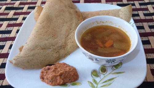 This is another version of dosa, which is mainly prepared with hara moong dal (green gram) with skin and rice batter. It goes well with peanut chutney and sambar. I have given it a twist to it by adding onions to the dosa.