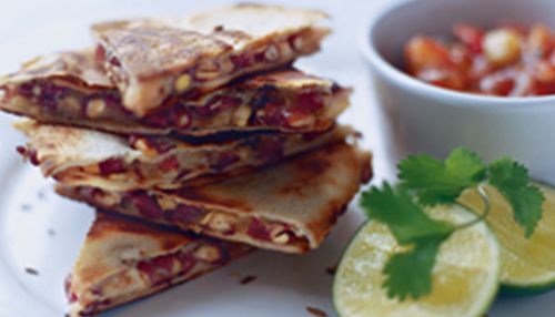 The nifty thing about this quesadilla is that the sprout filling sticks inside, so you don’t have bits of veggies falling out when you eat it. If you’re making quesadillas for a crowd, simply assemble them on a baking sheet, and bake 10 to 15 minutes at 180°C, or until cheese inside has melted.