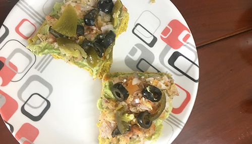Mix diced onions and tomatoes, steamed sweetcorn, salt, black pepper, oregano and rosemary. Layer the mixture on the flatbread above the avocado.