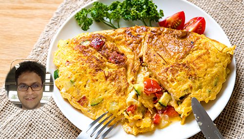 It's a modification of Spanish omelette with an Indian and French twist. Indian like spicy, French like cheese and Spanish like a heavy and filling omelette loaded with vegetables and butter. So, it's a blend of these three cultures. It's a perfect dish for a heavy breakfast or even a late Sunday brunch. There is nothing exotic about the ingredients, everything is desi but the cooking style is surely European. The omelette is fluffy and thick with lots of butter and vegetables like onions, tomatoes, capsicum and chillies.