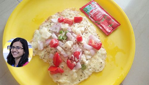 This recipe is easy to make, tasty and healthy at the same time. It is a quick hunger solution for working professionals and kids alike. Cheese-melette-izza is a combination of cheese, omelette and pizza mix. The crisp base combined with melting cheese is perfect for an evening snack or breakfast! Enjoy it with a dash of ketchup!