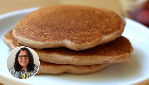 Wheat pancakes are a healthy breakfast meal. The sweet aroma of egg, milk and vanilla, makes it a delicious treat for all.