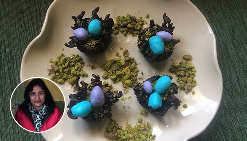 Once both the nests and the eggs are ready, sprinkle some ground pistachios on the nests and place the buttercream eggs on them. Now, they are ready to serve.