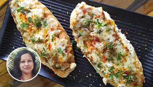 It's a kids favourite fusion recipe made with bread filled with delicious pav bhaji, topped with diced cheese.