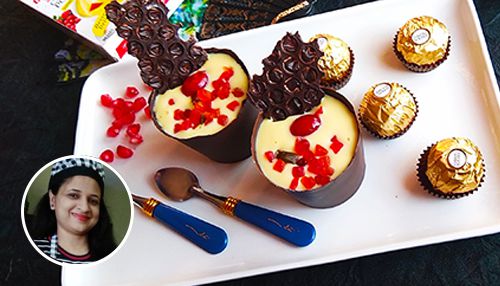 Fill the chocolate cup with fruit custard.