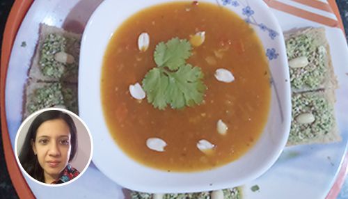 Thai spiced vegetable soup is warm and delicious. It is served with Thai toast with a twist.