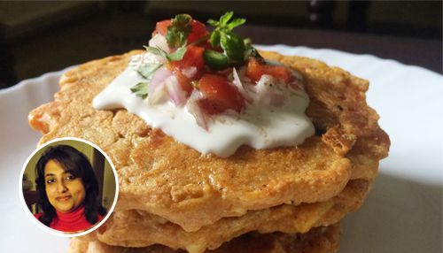 Corn cakes are flavourful pancakes, pretty healthy and ideal for brunch. The best way to have them is to top them with cream and fresh salsa.