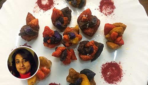 Divide each of the three doughs into small balls. Roll out each ball and cut out small roundels with the help of a cookie cutter.