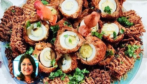 Hard-boiled eggs wrapped in spicy mashed potato covering