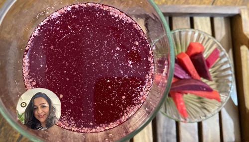 Kanji is a fermented drink made with carrots and beetroot and fermented in a jar for 2-3 days during winter time. Its a great probiotic and promotes gut heath and is a great immunity booster.