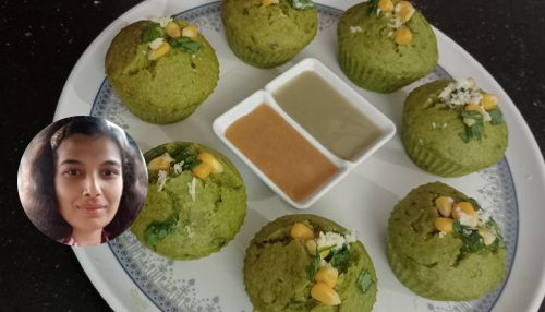 Healthy and instant savoury muffins made with leafy greens and corn.