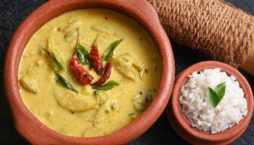 Experience the tangy delight of Kalan, a quintessential Onam Sadhya dish made with creamy yoghurt and tender yam.