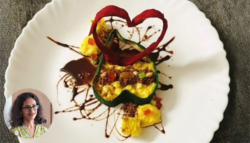 This is my innovative festive Diwali dish. I made deconstructed gujiya with baked custard kalakand. This unique Diwali gujiya is filled with dry fruits, coconut, kalakand, custard and chocolate sauce. So, it's a celebration in itself.