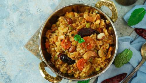 Translating to "Hot Lentil Rice" in Kannada, Bisi Bele Bath combines rice, lentils, and vegetables simmered in aromatic spices.