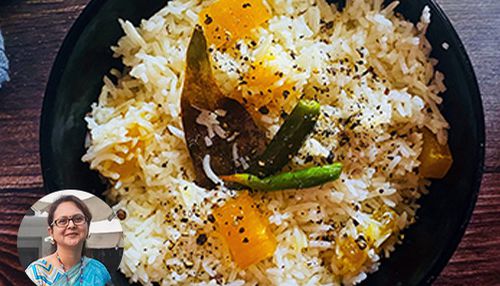 A fragrant Bengali delicacy, this Narkeli Aamsotto Golmorich Pulao blends coconut, mango leather, and pepper for a subtly sweet and spiced twist on traditional pulao.