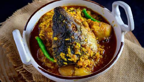 A Bengali classic where rohu or catla fish head is fried golden in mustard oil then slow-cooked with fragrant Gobindobhog rice and potato — a dish Bengalis consider too precious to skip at any celebration.