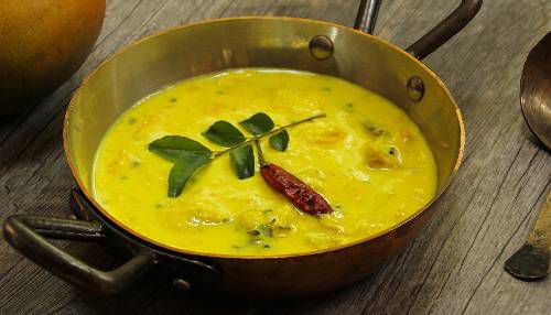 Kerala's Vishu sadya centrepiece — ripe mango simmered in a lightly spiced coconut-yoghurt curry. Sweet, sour and creamy, best eaten with Kerala red rice.