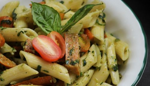 Delicious and quick pasta dish. Served with richness of basil leaves and chicken sausages.