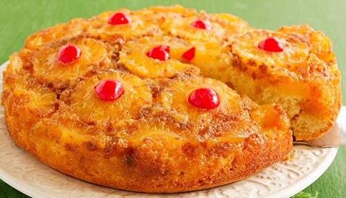 An upside-down cake is a cake that is baked in a pan, then turned over and served upside-down. It was first invented by a house wife in America. Chopped fruits such as apples, pineapples or cherries along with a butter and sugar topping are placed on the bottom of the pan. Then the batter is poured in, so that they form a decorative topping once the cake is inverted. American pineapple upside-down is one of the Traditional upside-down preparations.