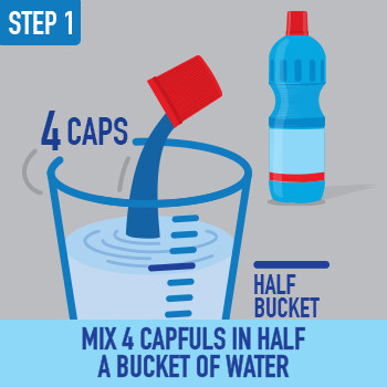 Pour 4 capfuls in half a bucket of water (4 litres) for removing tough dirt, stains, and germs.