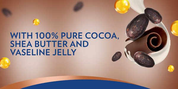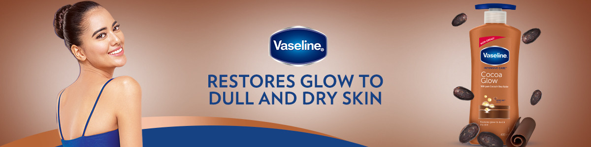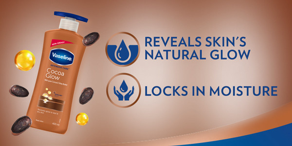 Vaseline Intensive Care Cocoa Glow Body Lotion with 100% pure cocoa, shea butter and micro droplets of Vaseline jelly keeps skin moisturized all day long & enhances skin’s natural radiance.