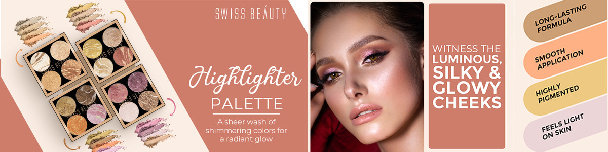 Create a radiant glow with Swiss Beauty Highlighter Palette. The soft and shimmering colors create a natural healthy glow. The long-lasting, smooth formula provides an even application. It can also be used on the eyes - apply wet to create an intense foil-like finish.