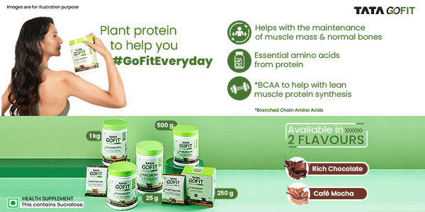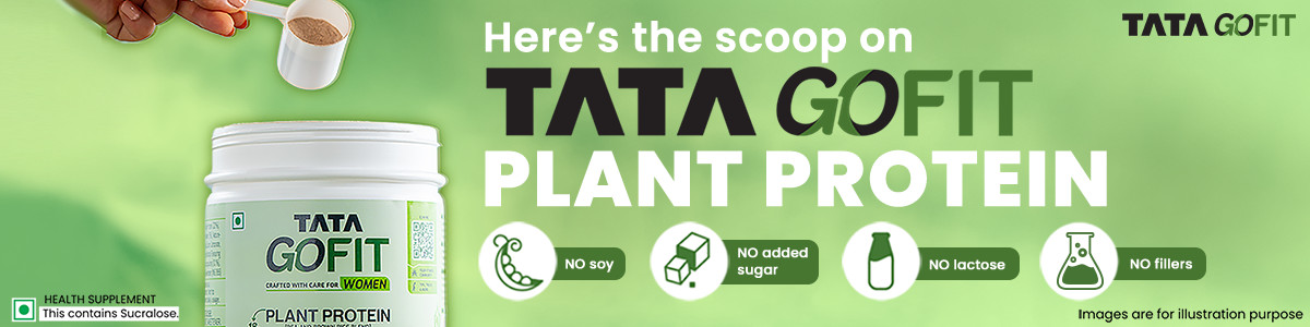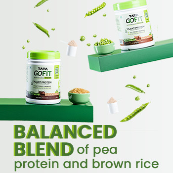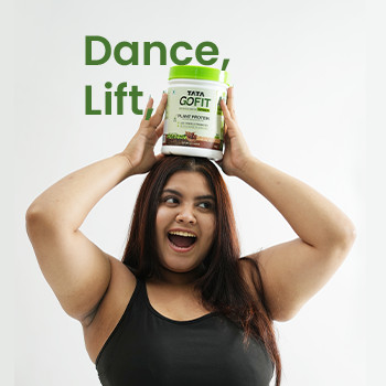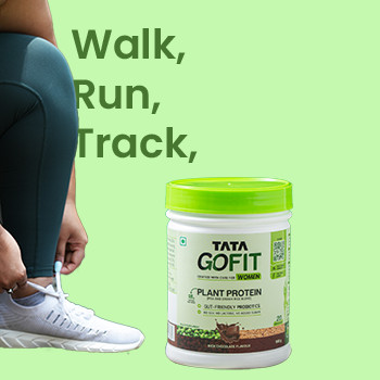 Introducing Tata GoFit plant protein powder for women, designed to cater to the protein needs for women who walk, track, run, dance, lift, stretch – or just move! This protein powder with gut-friendly probiotics delivers 18 g of protein per 25 g serve and is made from a blend of pea and brown rice that helps with the maintenance of muscle mass & normal bones.