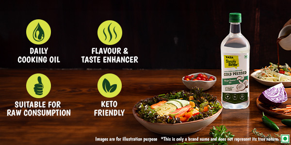 Enjoy the 100% Pure & Unrefined Cold Pressed Oil from the house of TATA. Indulge in a naturally cholesterol-free oil suitable for daily use with 0% trans-fat, which makes it ideal for everyday use and 60% MCTs that help boost energy^. Tata Simply Better Cold Pressed Oil comes in an anti-spill bottle that ensures the oil does not spill. Bring home the goodness of 100% Unrefined, 100% Cold Pressed and 100% Natural & Pure Oil.