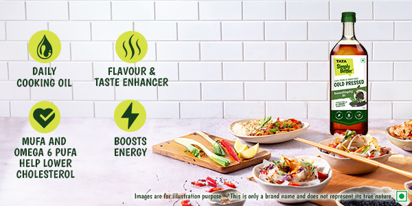Enjoy the 100% Pure & Unrefined Cold Pressed Oil from the house of TATA. Indulge in a naturally cholesterol-free oil suitable for daily use, contains MUFA & Omega 6 PUFA which help in lowering blood cholesterol and is also rich in Vitamin E, a natural antioxidant. Tata Simply Better Cold Pressed Oil comes in an anti-spill bottle that ensures the oil does not spill. Bring home the goodness of 100% Unrefined, 100% Cold Pressed and 100% Natural & Pure Oil.