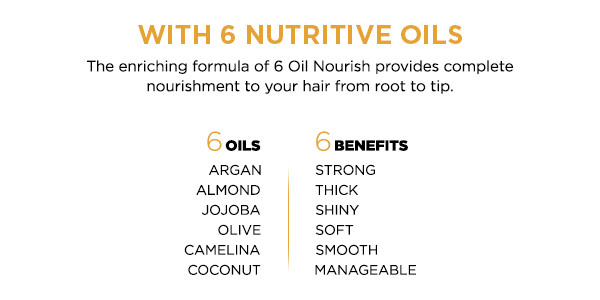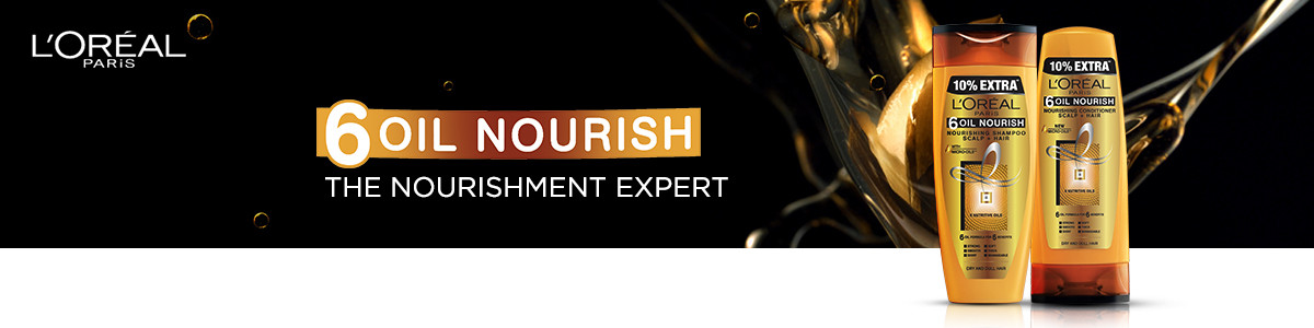L'Oreal Paris 6 Oil Nourish Shampoo has been created to provide complete nourishment to your hair from root to tip with six micro oils™ making it soft, shiny, thick, strong, smooth and manageable. Pamper your hair with the 6-Oil Nourish Shampoo personalized for your hair type. Science meets tradition with the infusion of 6 unique oils - Argan, Almond, Jojoba, Olive, Coconut, and Camelina. Penetrates deep into the scalp giving it utmost nourishment and care that is suitable for all hair types.