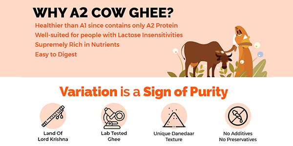 Our A2 ghee from land of lord Krishna has unique golden granular texture with a nostalgic & homely fragrance.