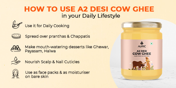 Ghee is not simply an addition to your diet but also helps for a balanced and active lifestyle. A spoon of A2 Desi Ghee consumed on empty stomach everyday in the morning can help relieve dryness, and regular consumption can help reduce cholesterol, improve the heart's functioning, and reduce joint pain.