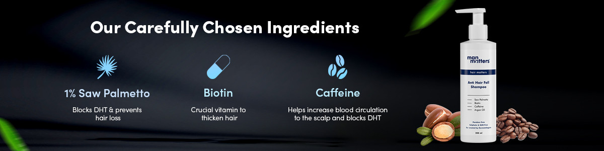 Start your Hair Fall treatment right with the Man Matters Anti-Hair Fall shampoo. This 2-in-1 DHT blocker shampoo helps reduce hair fall and strengthen hair follicles. This hair fall shampoo for men helps clean your scalp and treat your hair with nourishing ingredients. The Saw Palmetto & Caffeine helps prevent DHT formation- a hormone responsible for hair loss. This shampoo is enriched with Biotin which helps stimulate hair follicles and strengthens hair. Argan Oil is considered as a rich source of Vitamin E. This not only makes your hair stronger but also keeps it free from frizz.