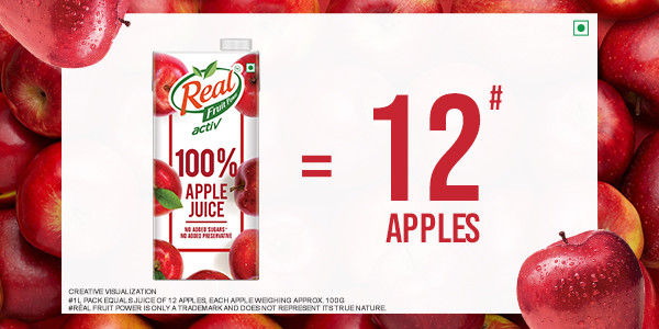 1L Pack of Real Activ Apple Juice equals juices of 12 apples , each apple weighing 100gm.