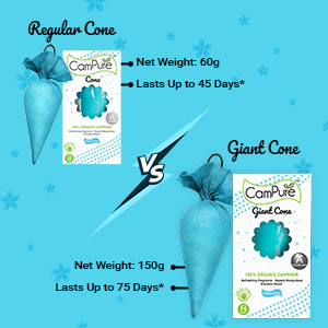 Campure Giant Cones weigh 150g and last for up to 75 days. You can experience a unique camphor based fragrance that fills home with positivity. It makes you feel fresh and healthy. It helps to repel mosquitoes and also elevates mood.