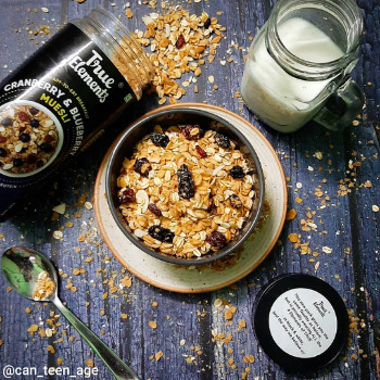 True Elements Cranberry Blueberry Muesli is a delicious healthy alternative for your breakfast cereals. It is enhanced with the sweetness of luscious blueberries, tangy flavour of cranberries along the crunchiness of oat and wheat flakes. The berries add antioxidants to the muesli that helps in boosting the immunity system.