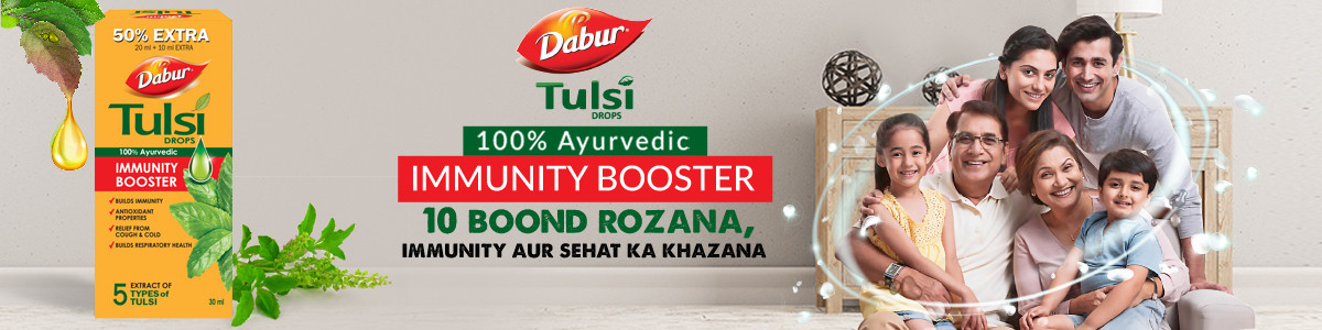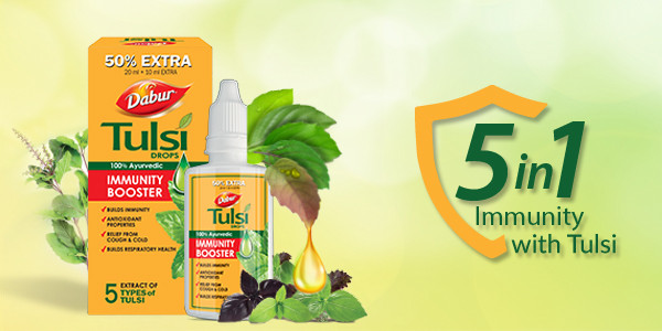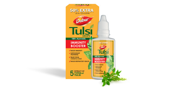 Dabur Tulsi Drops combines the rich experience of Dabur with the goodness of five types of Tulsi that are attributed to various health benefits. To protect yourself and your family from various infections, take Dabur Tulsi Drops which helps boost your Natural immunity.