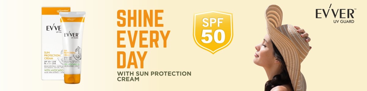 Step Out without the fear of getting sunburn or tan. Evver UV Guard Sun Protection Cream is broad spectrum SPF 50+, PA+++ formula which protects your skin from harmful UVB rays. Avocado Oil in Evver UV Guard provides added protection from sun.