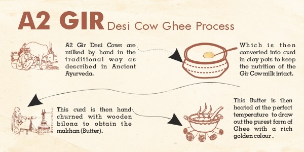 - The rich butter is then which has been drawn from 30 kgs of A2 milk is then heated at the specific temperature in a wood furnace to lock in the original taste and flavor of Desi ghee.